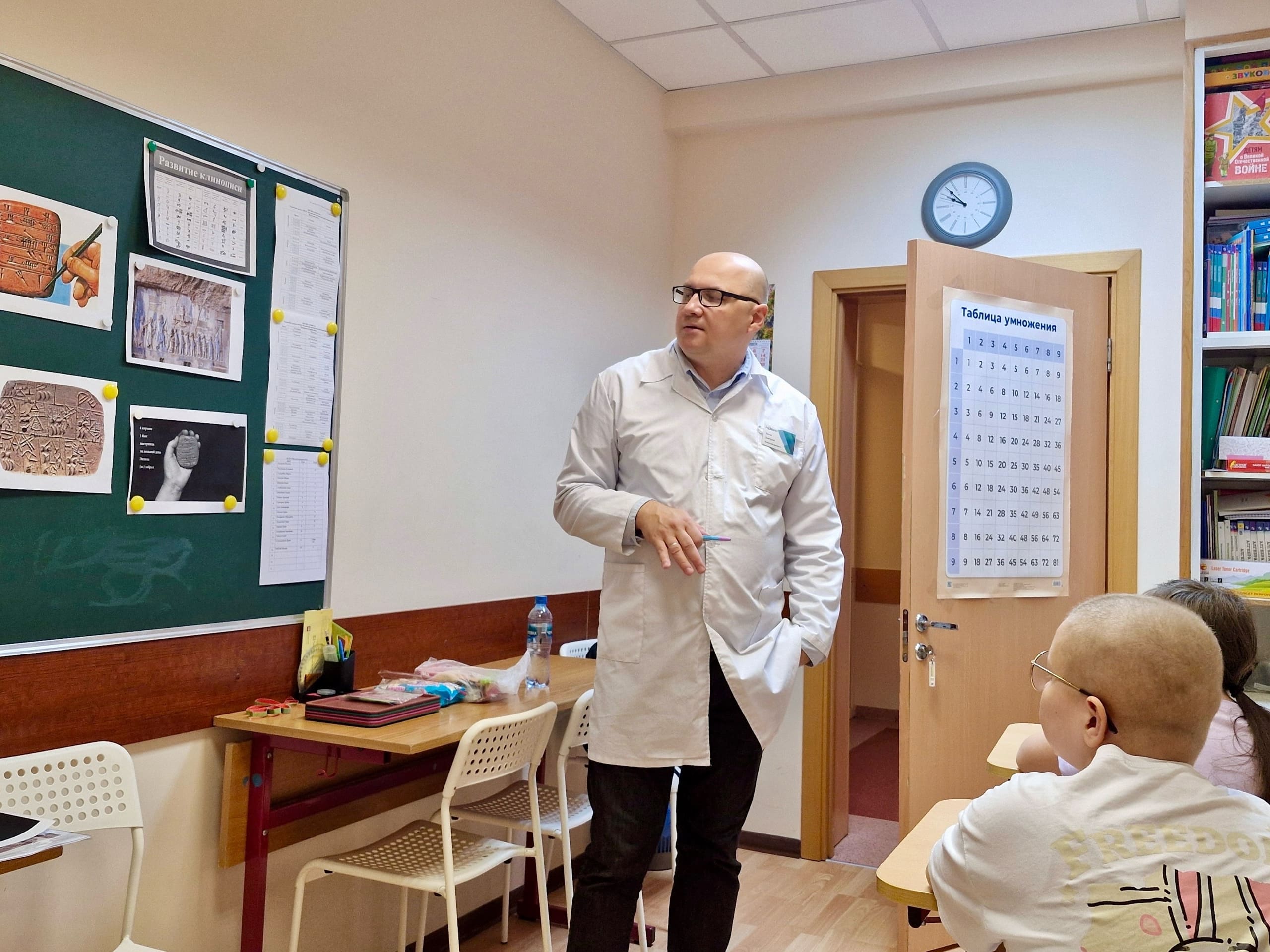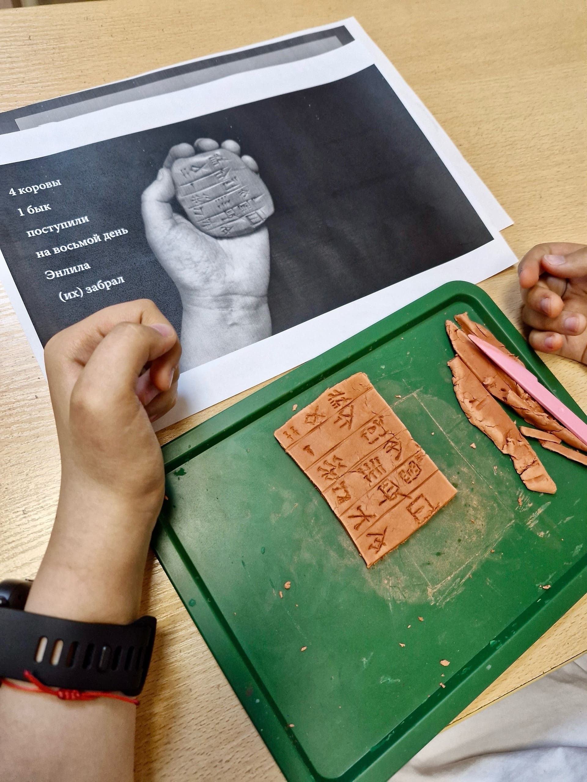 Учитель истории Дмитрий Александрович Пегов провел мастер-класс «Древняя письменность шумеров» для учеников Российского научного центра рентгенорадиологии. Ребята познакомились с историей древней письменности государств Междуречья. Дмитрий Александрович рассказал, как со временем менялась клинопись и как ученым удалось дешифровать древний язык шумеров. После устного рассказа учителя ребята своими руками сделали глиняные таблички и написали текст, используя клинописные знаки.