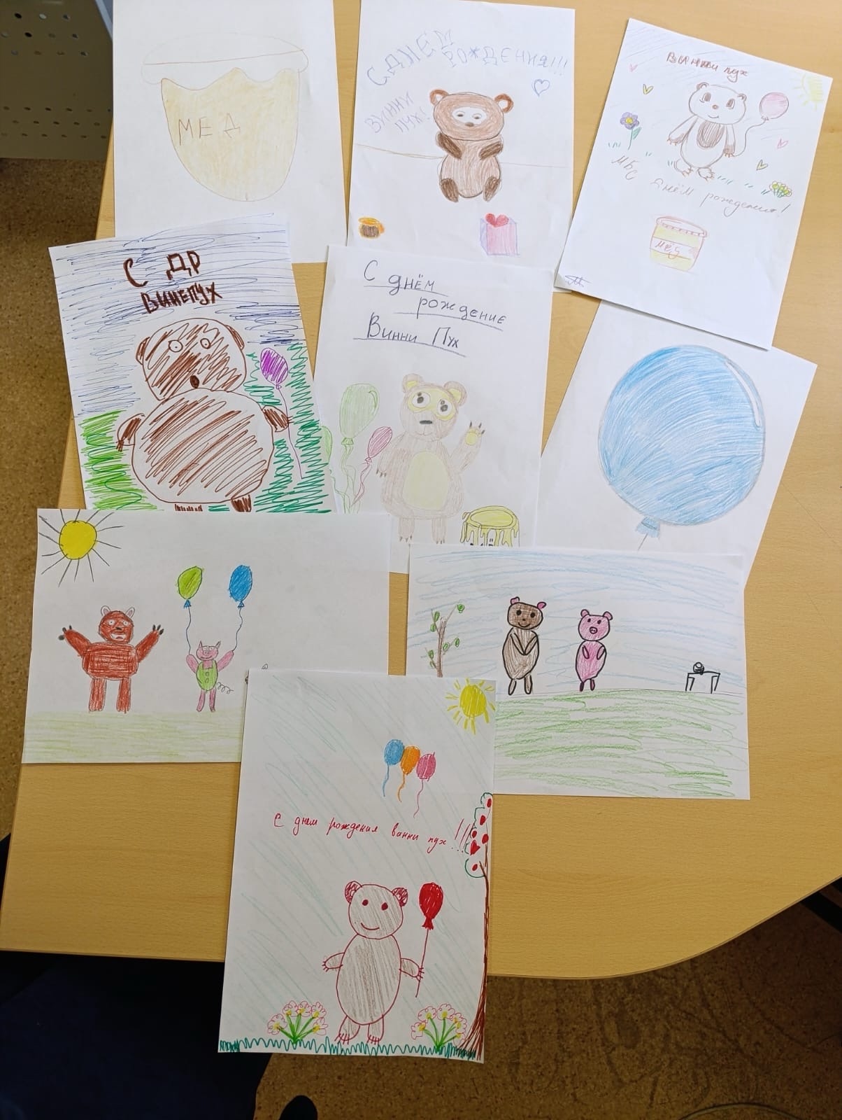 Так как на День рождение принято ходить с подарками, то ребята решили нарисовать открытки для Винни Пуха. Но и медвежонок не остался в долгу -- угостил ребят конфетами. Помогали ребятам педагоги Гурова Юлия Петровна и Бондаренко Наталья Петровна.