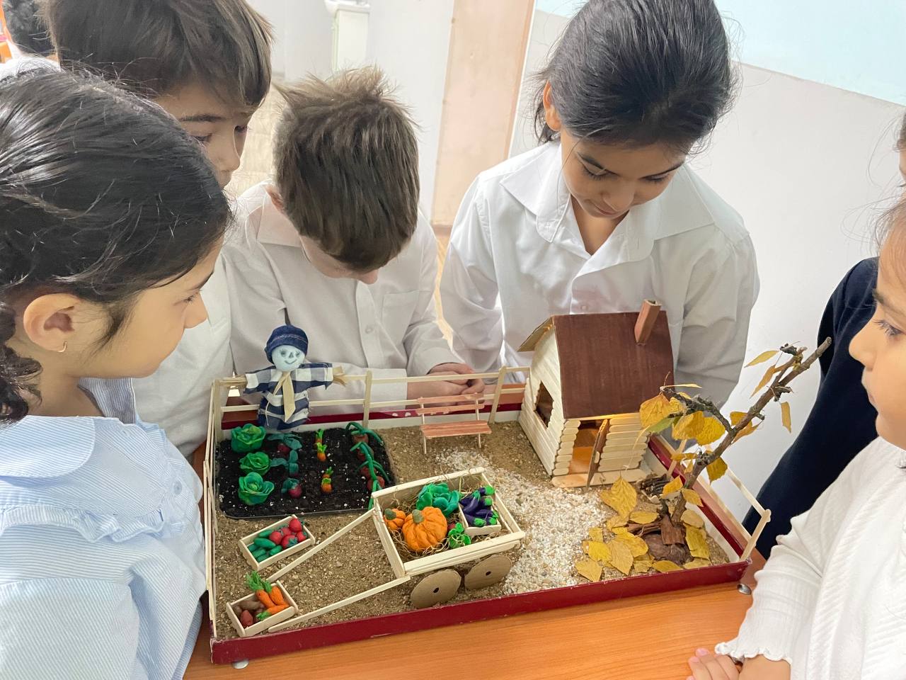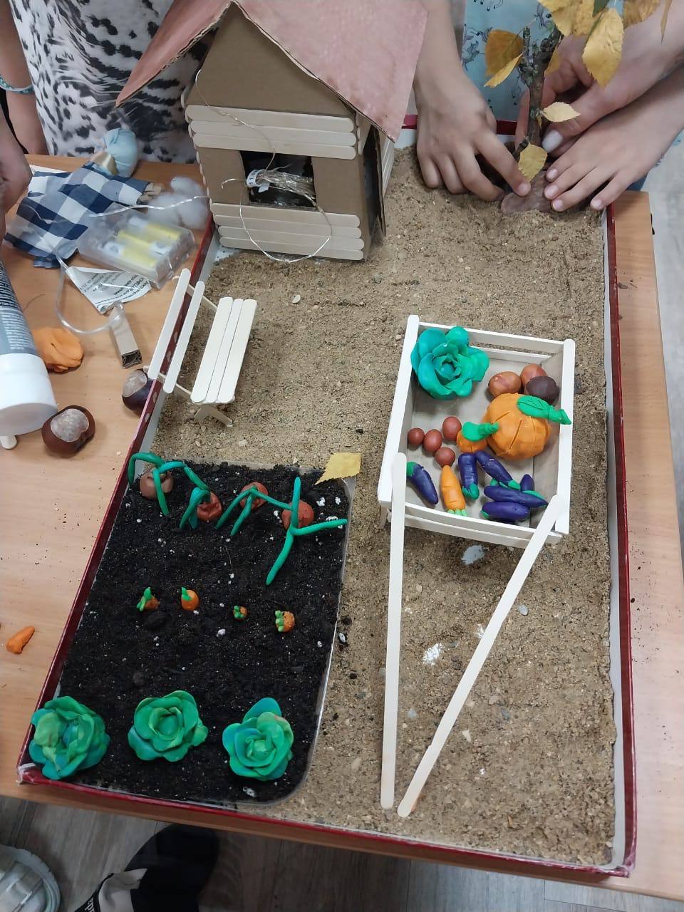 Целью проекта было знакомство детей с осенним урожаем, обучение навыкам лепки из пластилина, работе с иголкой и ниткой, созданию декора с использованием подручных материалов по заданной тематике. Малыши с интересом отнеслись к проекту и с большим удовольствием приняли участие в создании итогового продукта-инсталляции деревенского дворика. Ребята обсудили, что нельзя ломать ветки с живых деревьев, а ветка, использованная в качестве дерева в этом проекте, была взята со спиленного сухого дерева.